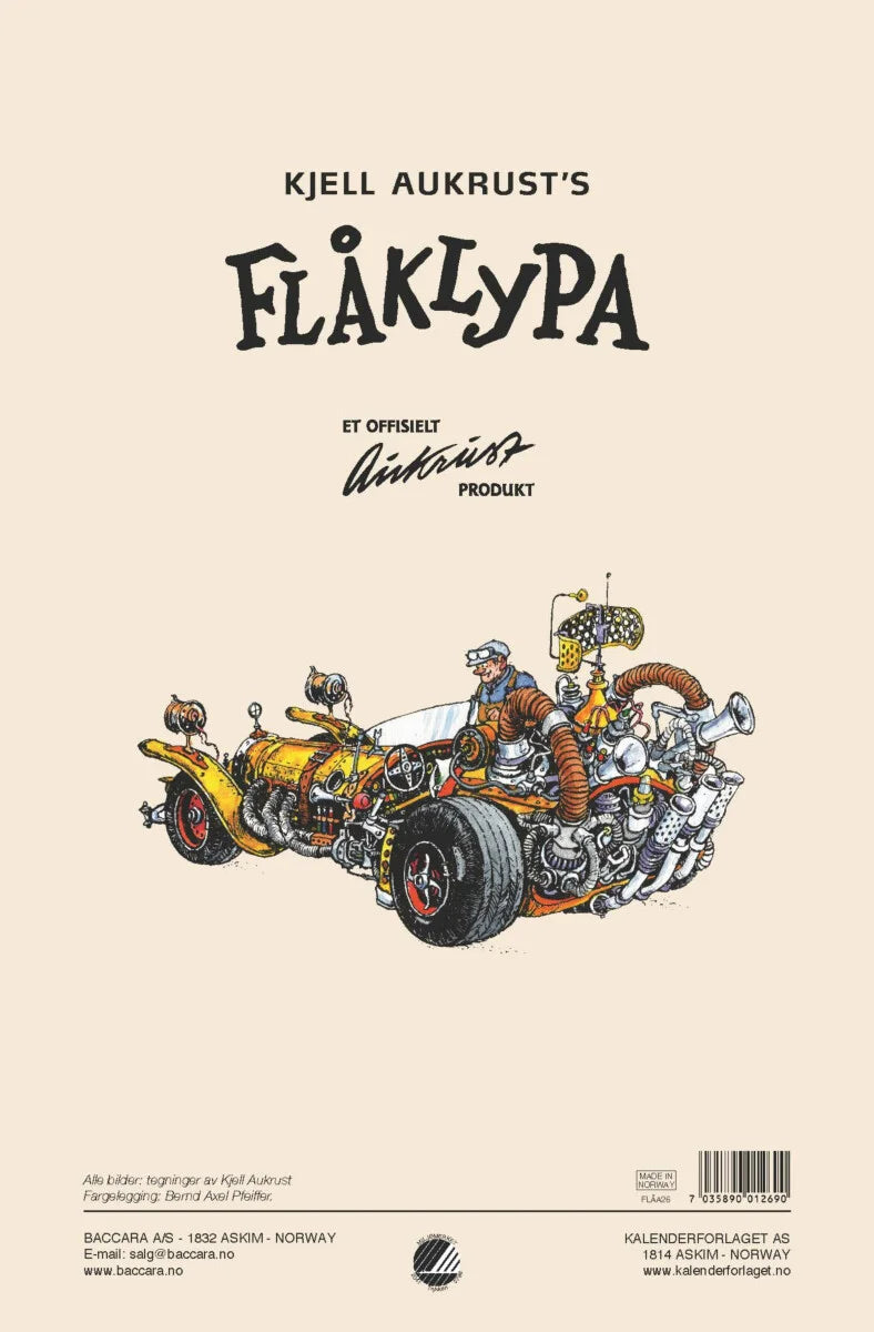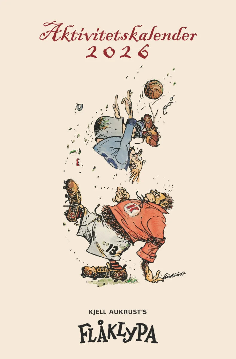 Aktivitetskalender for 2026 med bilder fra Kjell Aukrusts humoristiske Flåklypa-univers.